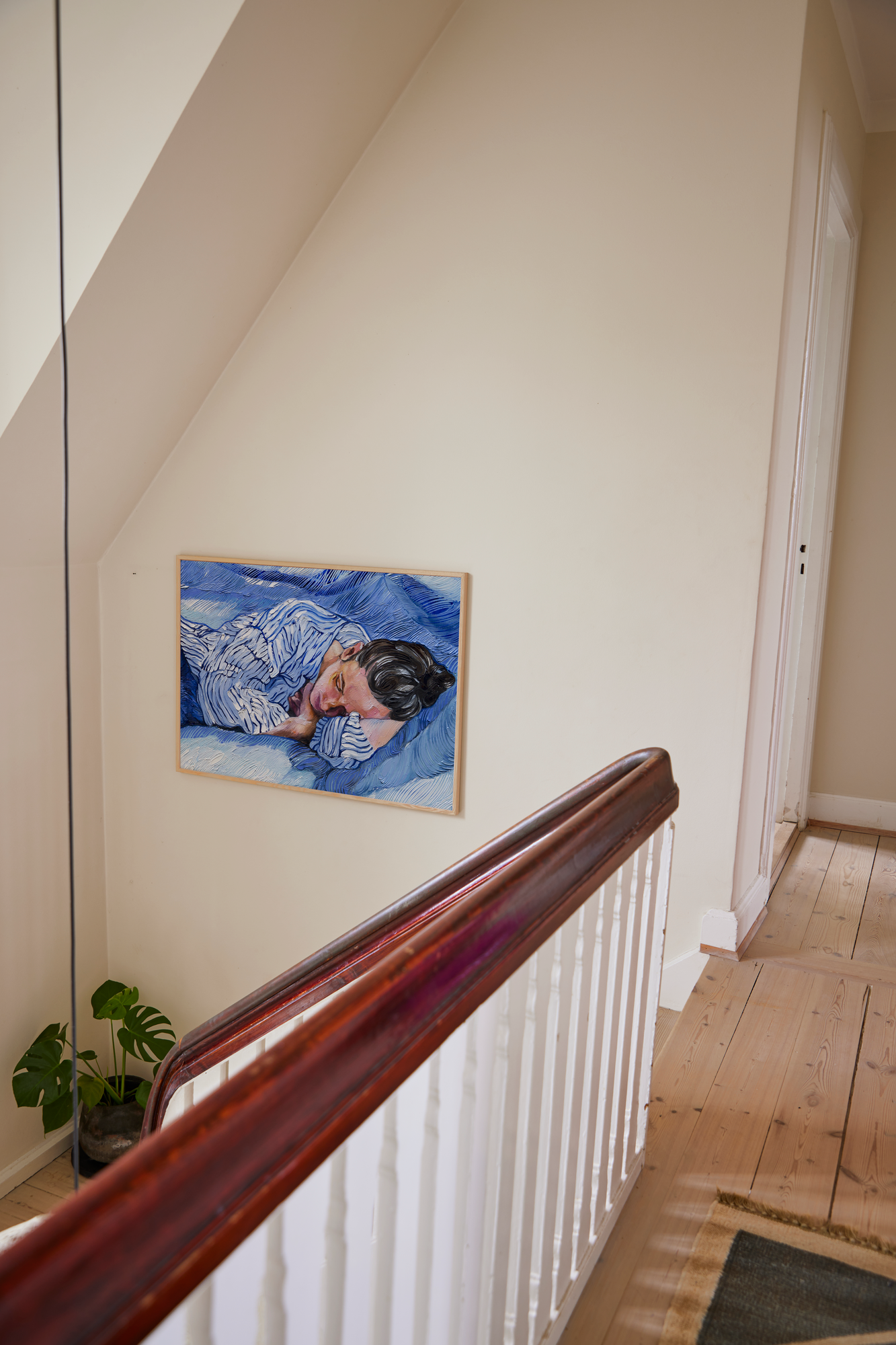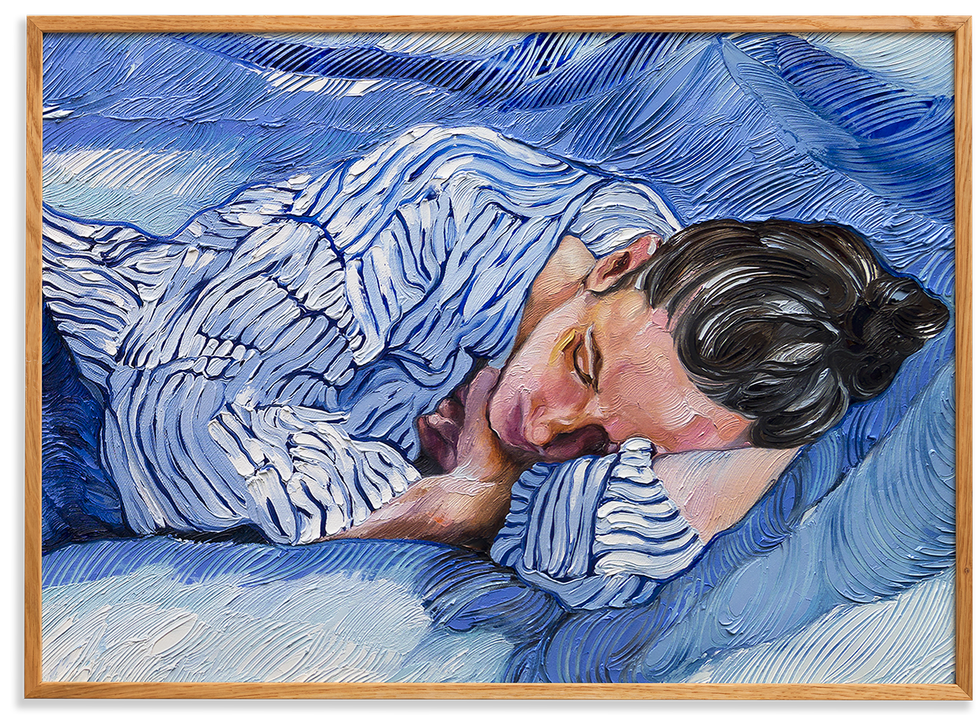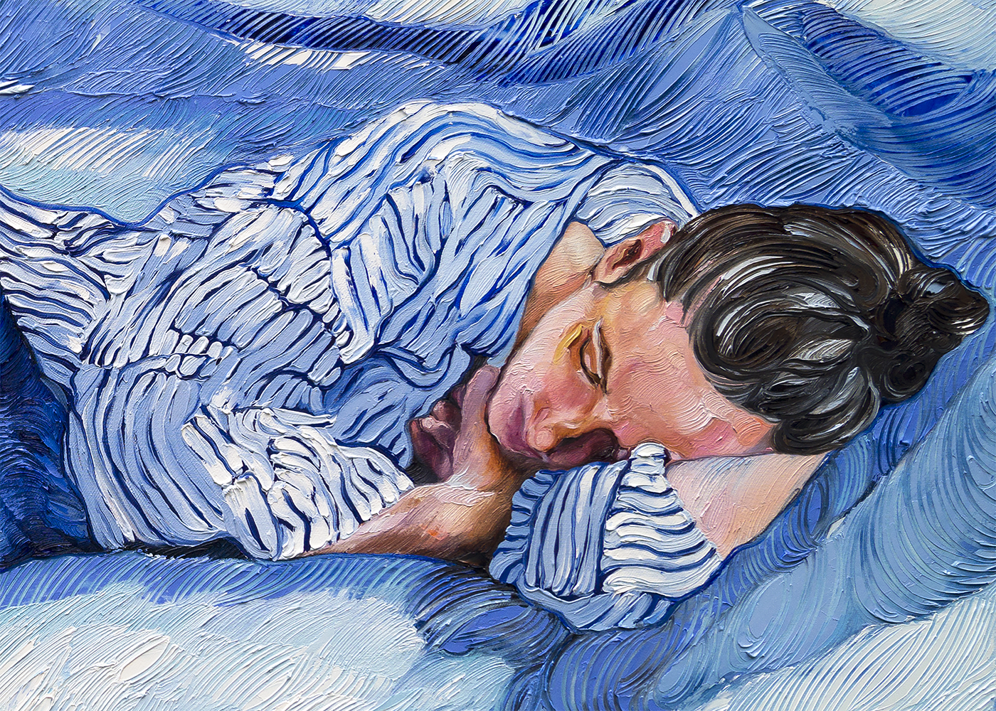 Cooling Dream captures a moment of relaxation by Copenhagen based artist Lolita Pelegrime. Translated through Pelegrime's rich and textural use of acrylic paint, layers of blue and white paint merge to reveal a sleeping figure - clothing and bedding merging to create a dream-like scene.