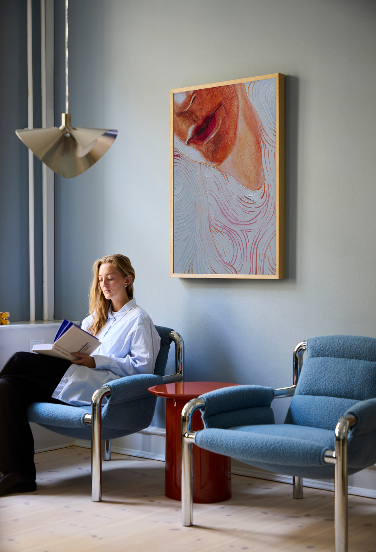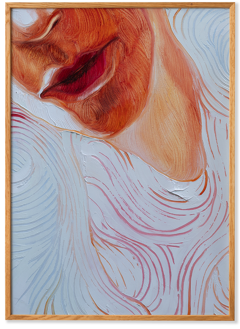 Fairy Floss by Copenhagen based artist Lolita Pelegrime presents an evolution of her textural approach to painting through a mix of flowing painted lines around a central form. Soft and light in appearance, the textural backdrop is punctuated by the richness of the female face.