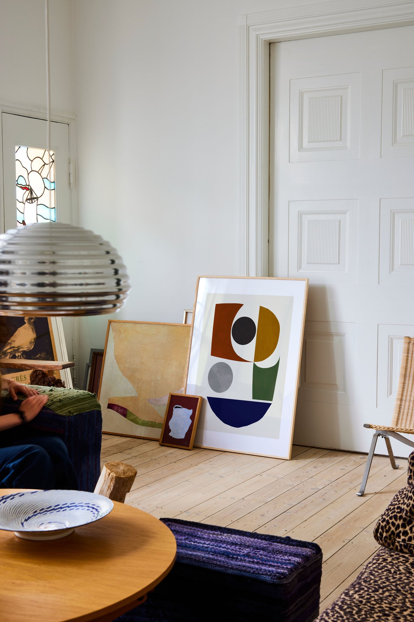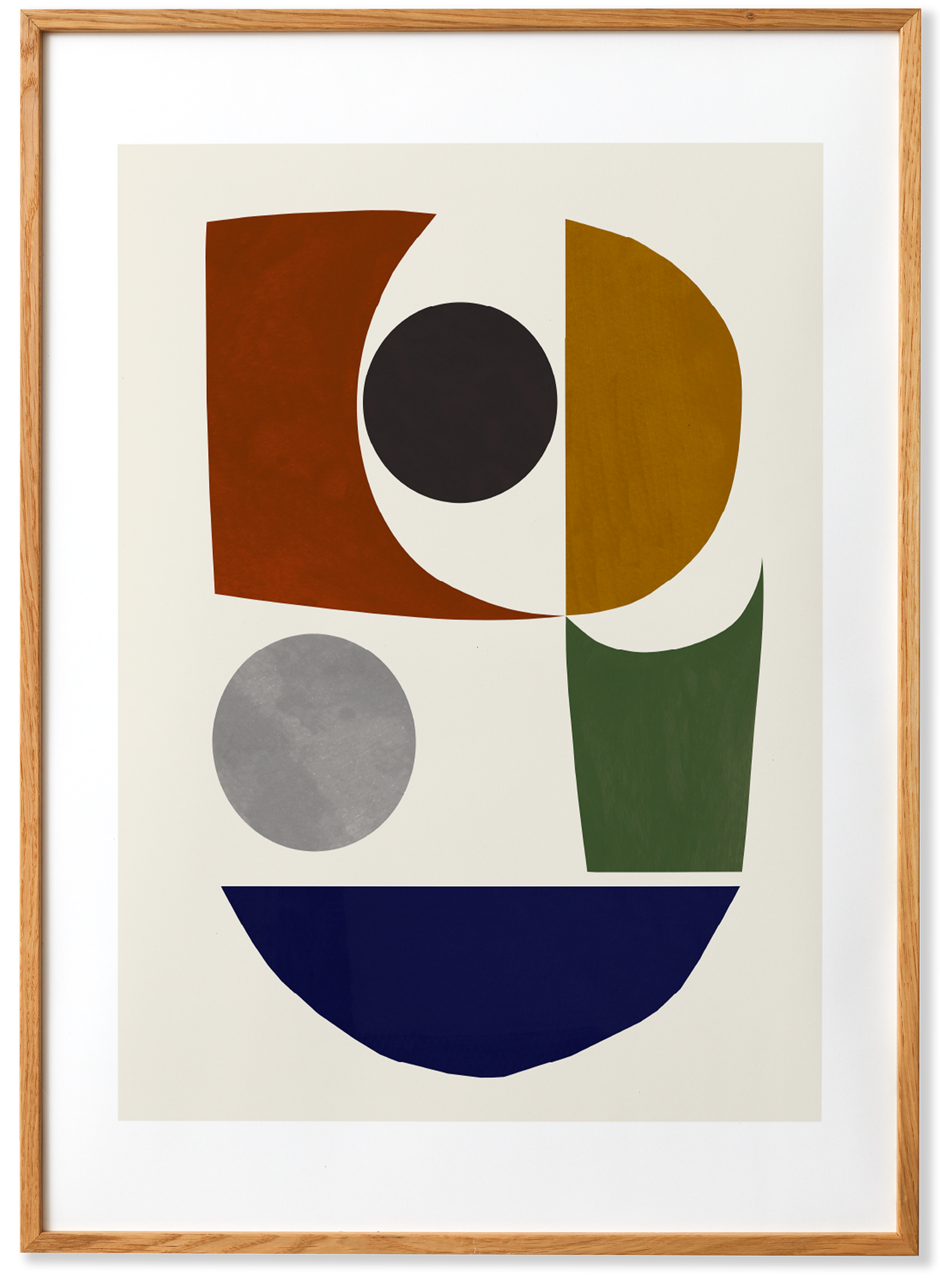 Berit Mogensen Lopez has boiled down the windswept form of a floating vessel in Floating. Created from hand painted paper cut out forms, the rounded shapes combine through playful colour to create a composition with that floating feeling.