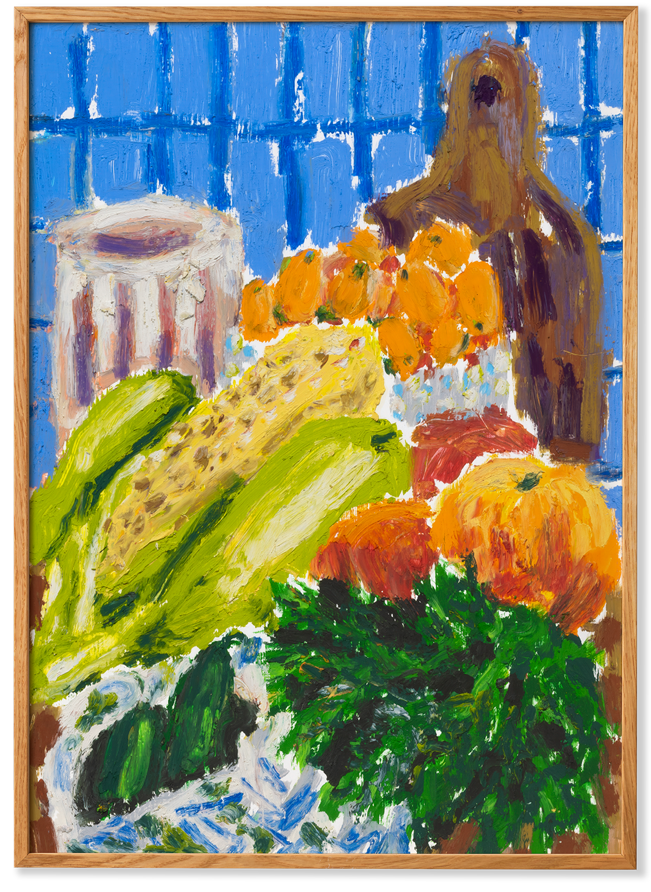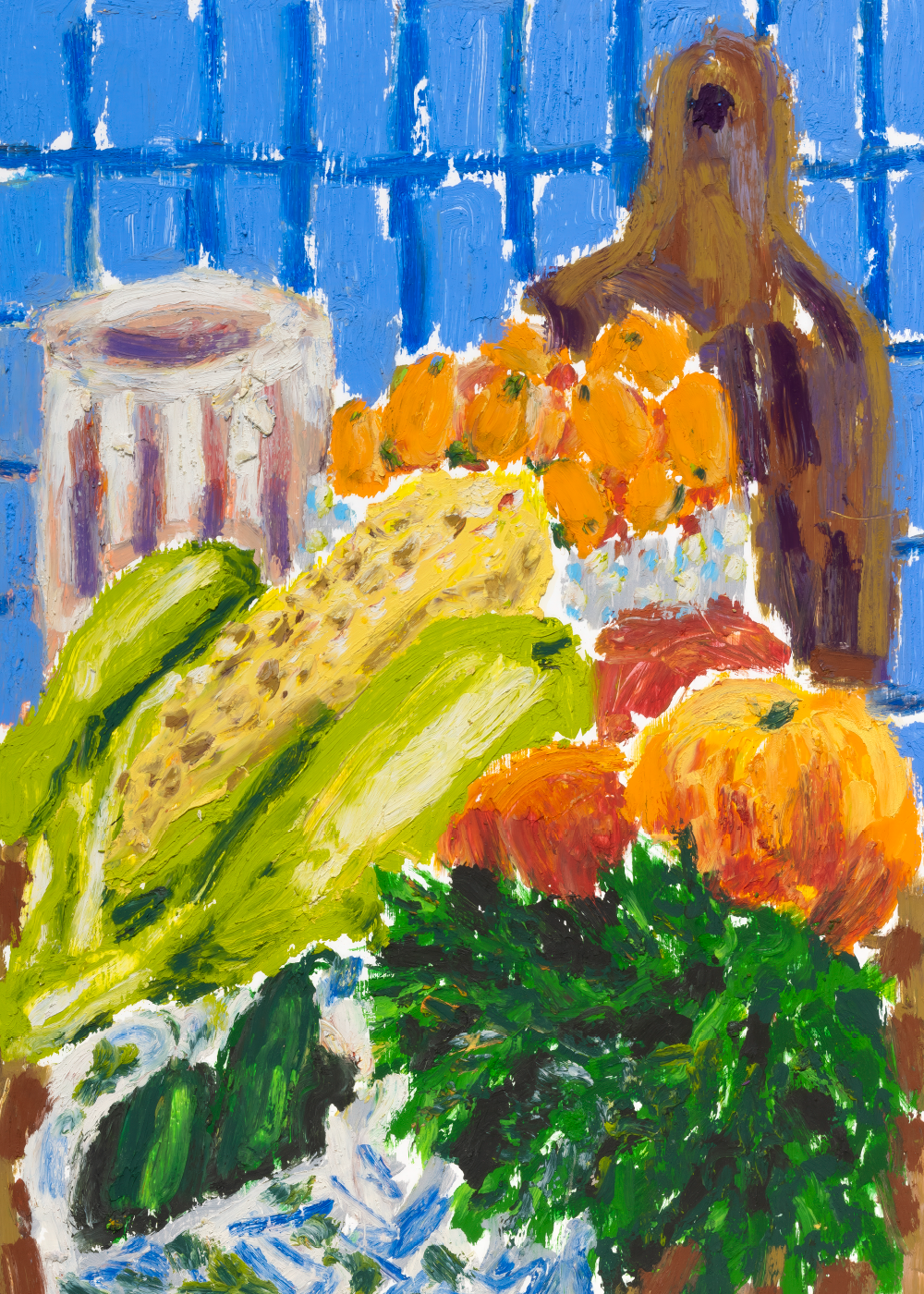 From the Market by artist Adee Ardon stems from the spontaneity of the creative process. Created without sketching or planning, colour and form combine through the use of thick oil pastels on a timber board. Letting go of perfection in way of therapeutic creativity, the composition expresses the richness of Mediterranean produce.