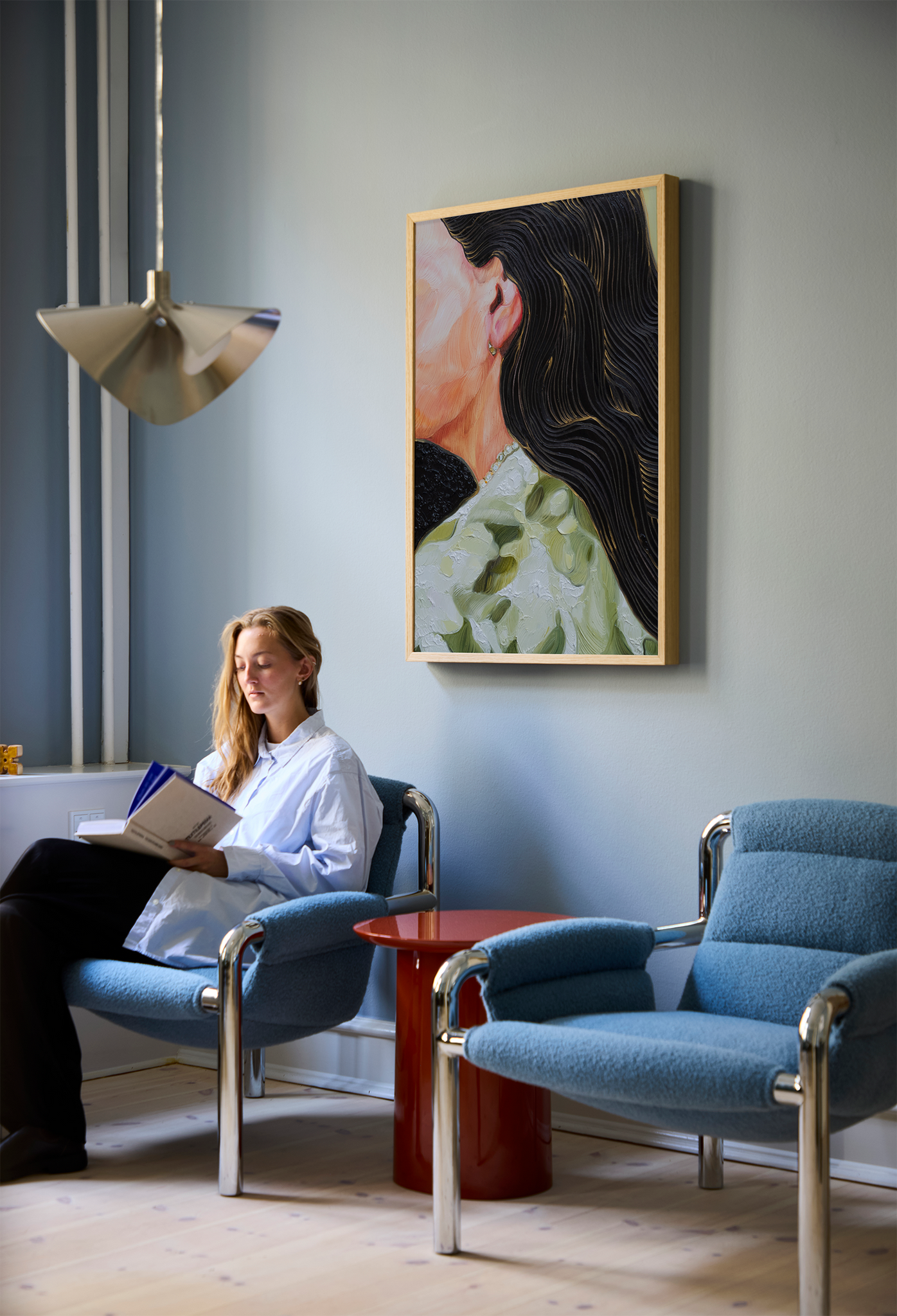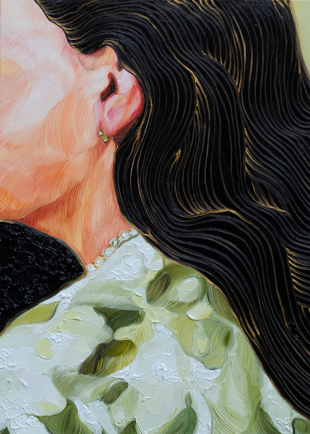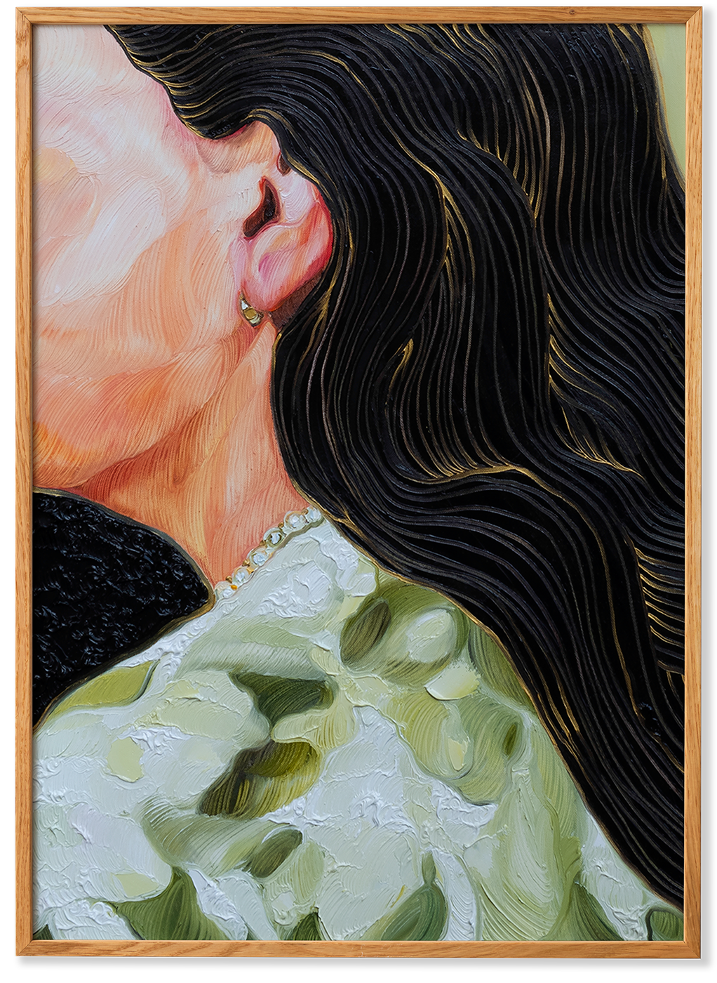 Golden Strands by Copenhagen based artist Lolita Pelegrime presents a subtle and quiet moment through her unique approach to painting. A single figure in tones of green is captured with long flowing black hair appearing to shine with streaks of gold.