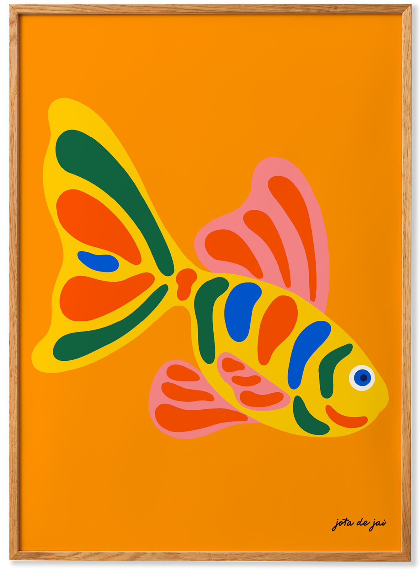 Goldfish by Spanish artists Jota De Jai is part of a family of illustrated animals inspired by Polish folk art. Each illustration is an attepmt to reduce the complexity of an animal to its simplest and most essential form. Through bold colours and simple patterns, the character of each animals is brought to life through a sense of fun and play.