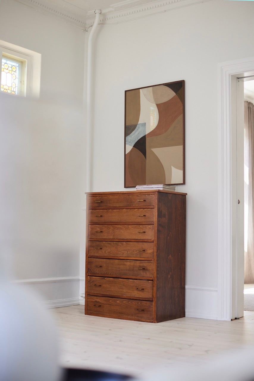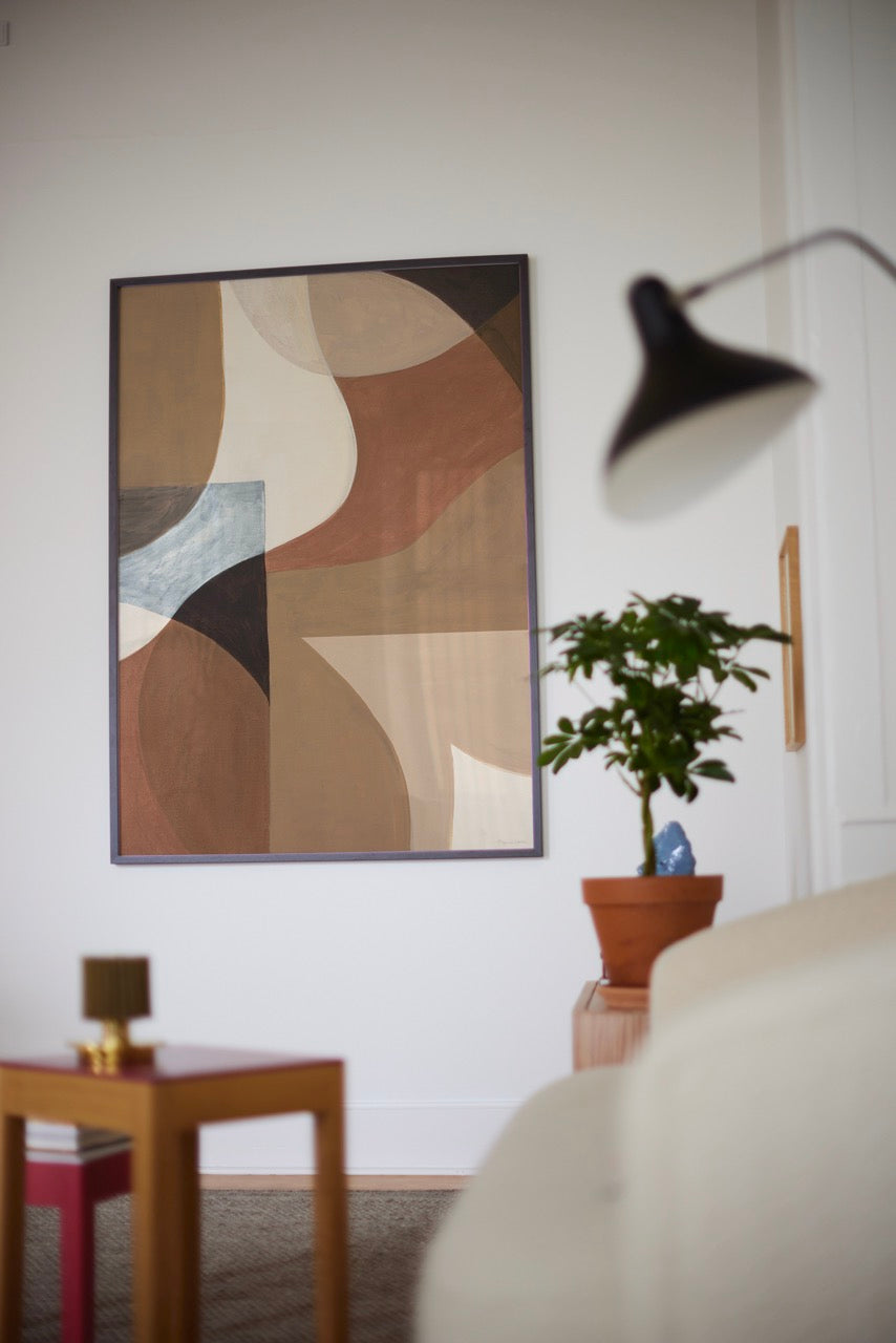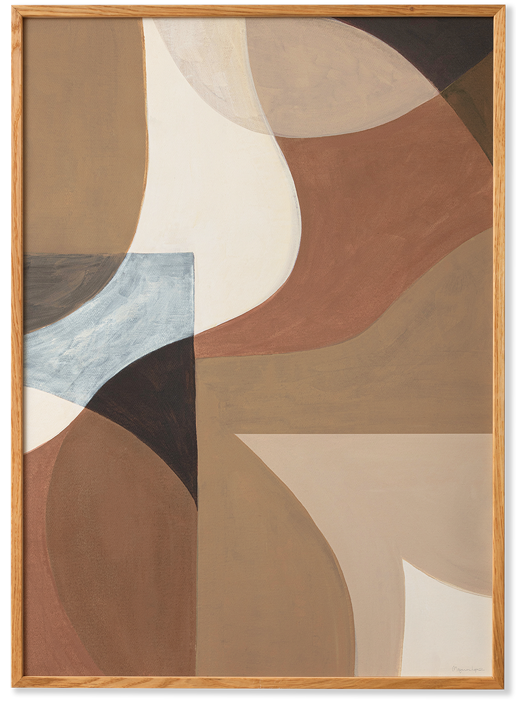 Abstract Movement 03 by local Copenhagen artist Berit Mogensen Lopez demonstrates her unique ability to combine colours and forms through a sense of dialogue. As the name suggests, a stream of curved and straight abstract shapes move and dance, highlighting a sea of warm browns puncturated by black and white tones.