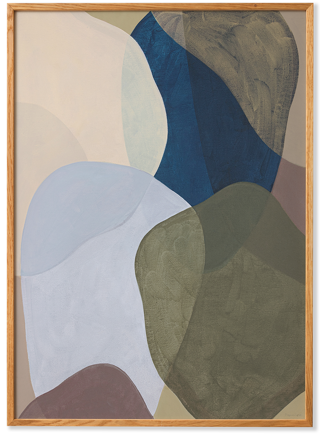 Abstract Movement 04 by local Copenhagen artist Berit Mogensen Lopez demonstrates her unique ability to combine colours and forms through a sense of dialogue. As the name suggests, a stream of curved and straight abstract shapes move and dance - soft an earthy tones of green, beige and brown punctuated by rounded blue shapes.