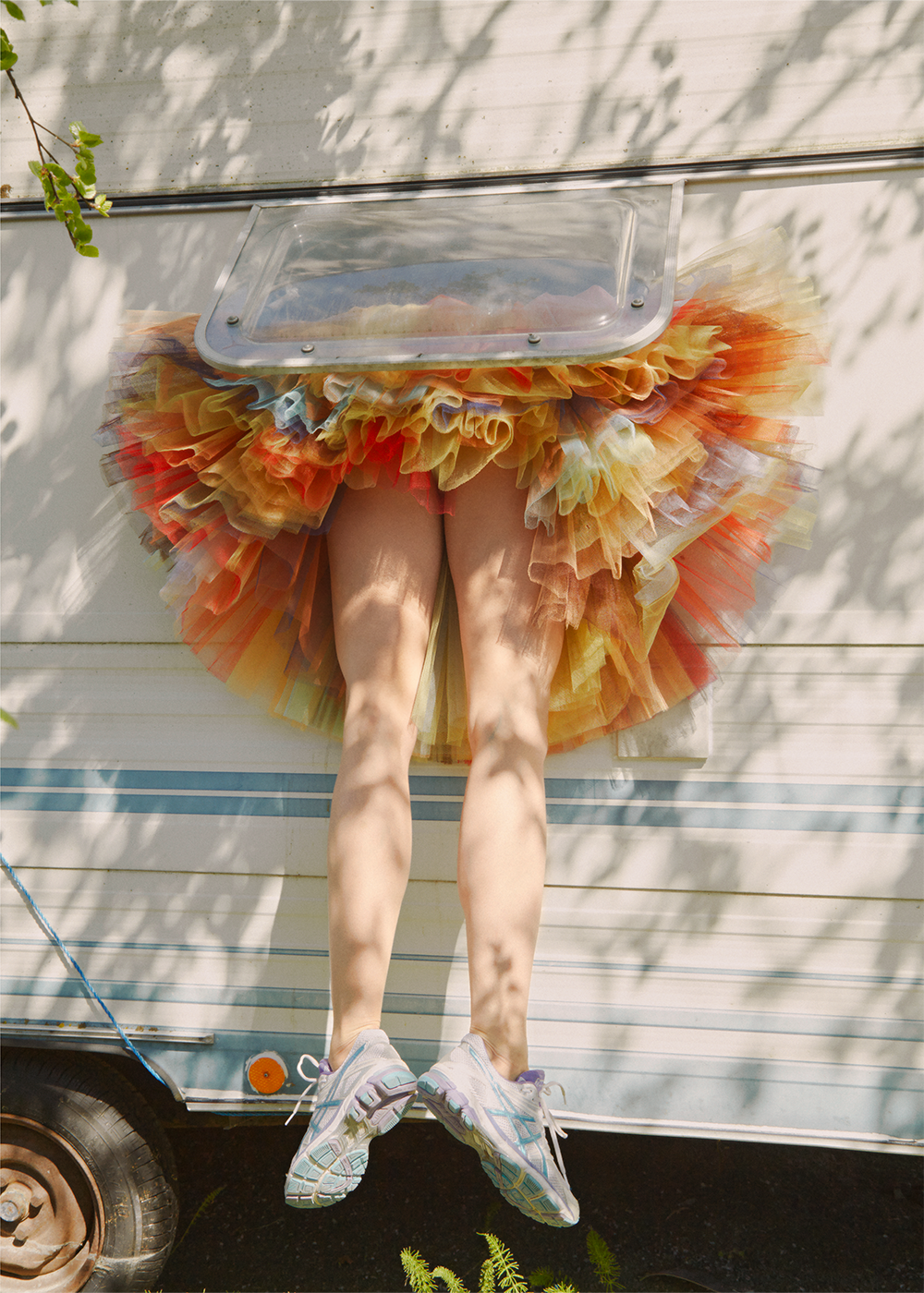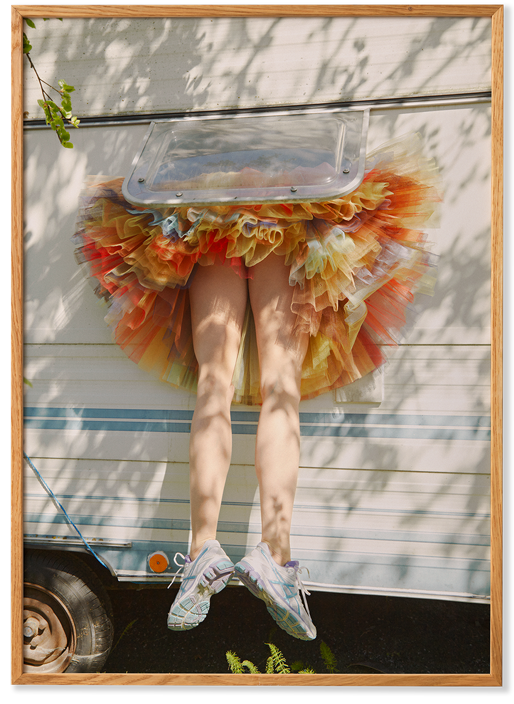 Norwegian photographer Julie Pike captured this image of a close friend whilst on a camping holiday in the mountains of Hemsedal. Spontaneous and full of whimsy, Ballerina features a single figure hanging from the campervan window in a ballerina's dress. The result is a photographic art print with a laid-back tension, with Pike’s friend caught floating in mid-air.