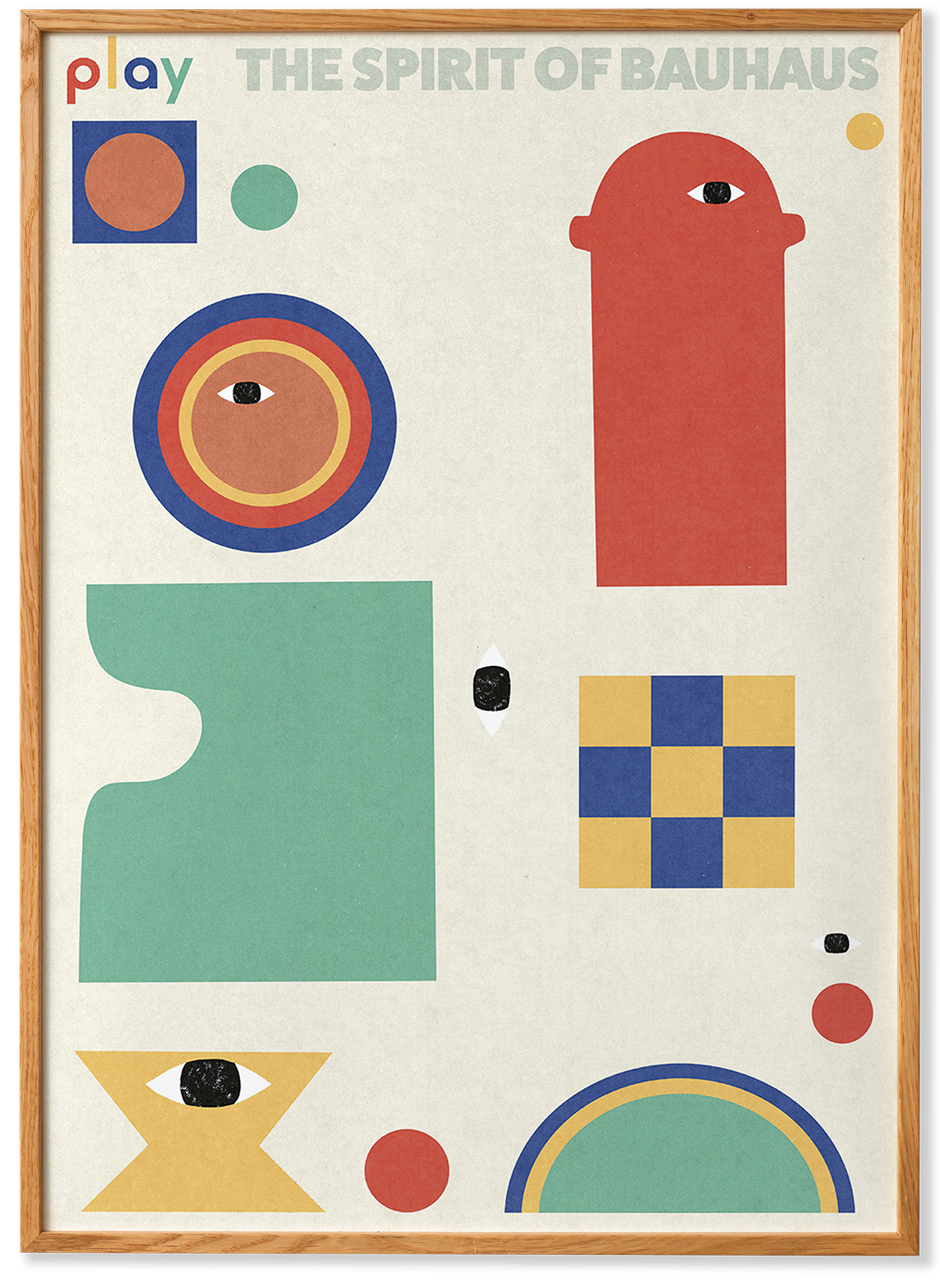 Bauhaus 02 is a playful art print by English artist Imo Sinclair. Imo Sinclair's latest collection combines abstract forms and playful colour combinations to create compositions inspired by the graphic and textile design from the Bauhaus movement. The collection is brought to life through eyes that give the abstract forms a sense of character.
