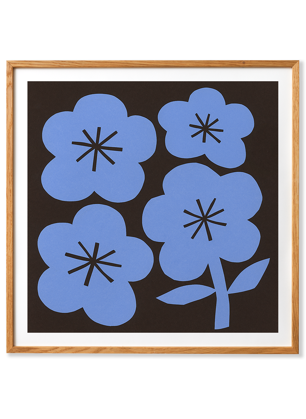 With her first collection for Paper Collective, Toronto based illustator Leia Bryans has focused on simple compositions that reflect everyday life. Created from cut origami paper, Blue Flowers is arranged as a series of florals in muted blue against a black back-drop, creating a graphic series of motifs.