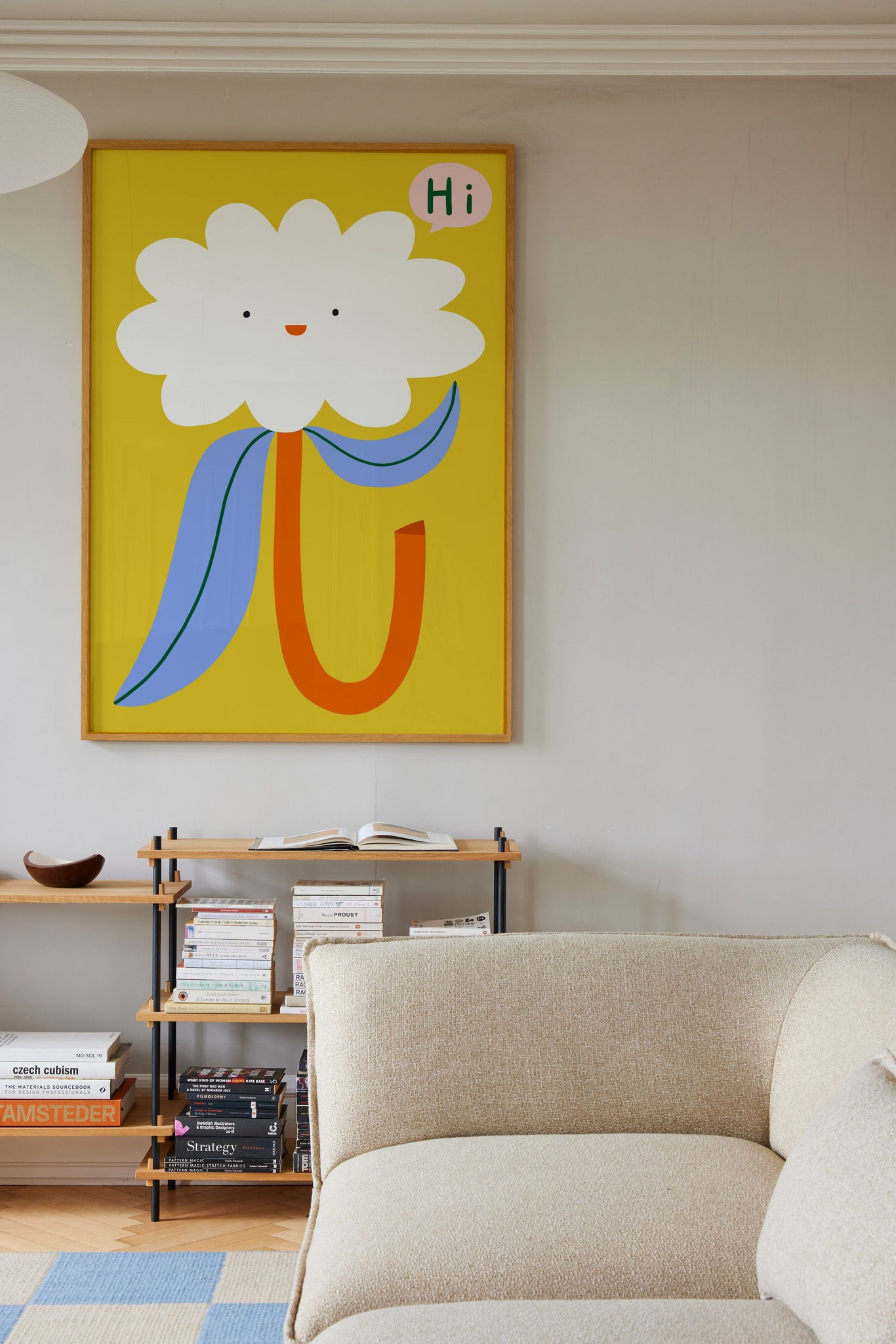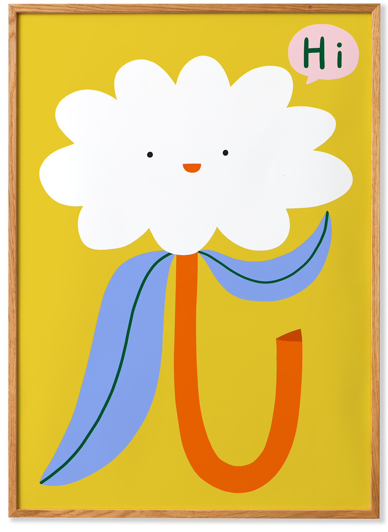 Osaka based artist Marina Ayashiro created her collection of cheerful florals to bring joy into your home. Hi Flower 01 features a colourful character in rich lavender, orange and yellow set against a vibrant purple backdrop.