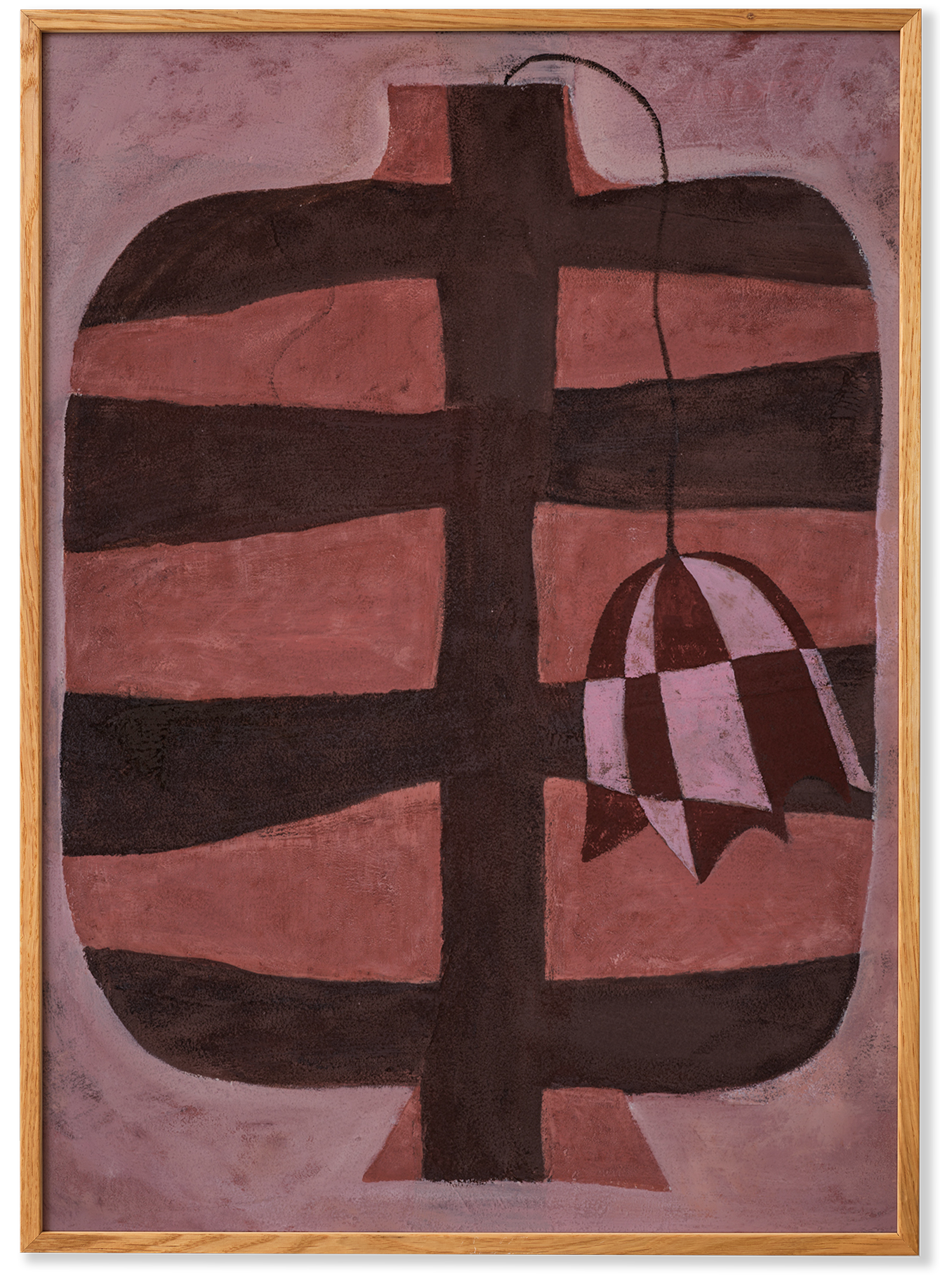 Lilly Rose is a warm and earthy art print by the Swedish artist Josefin Tolstoy. Various shades of dusty pink and ochre red creates the striking form of a striped vase. A similarly toned backdrop creates a consistency and depth to the composition, with a single flower standing out through subtle shifts in tone.