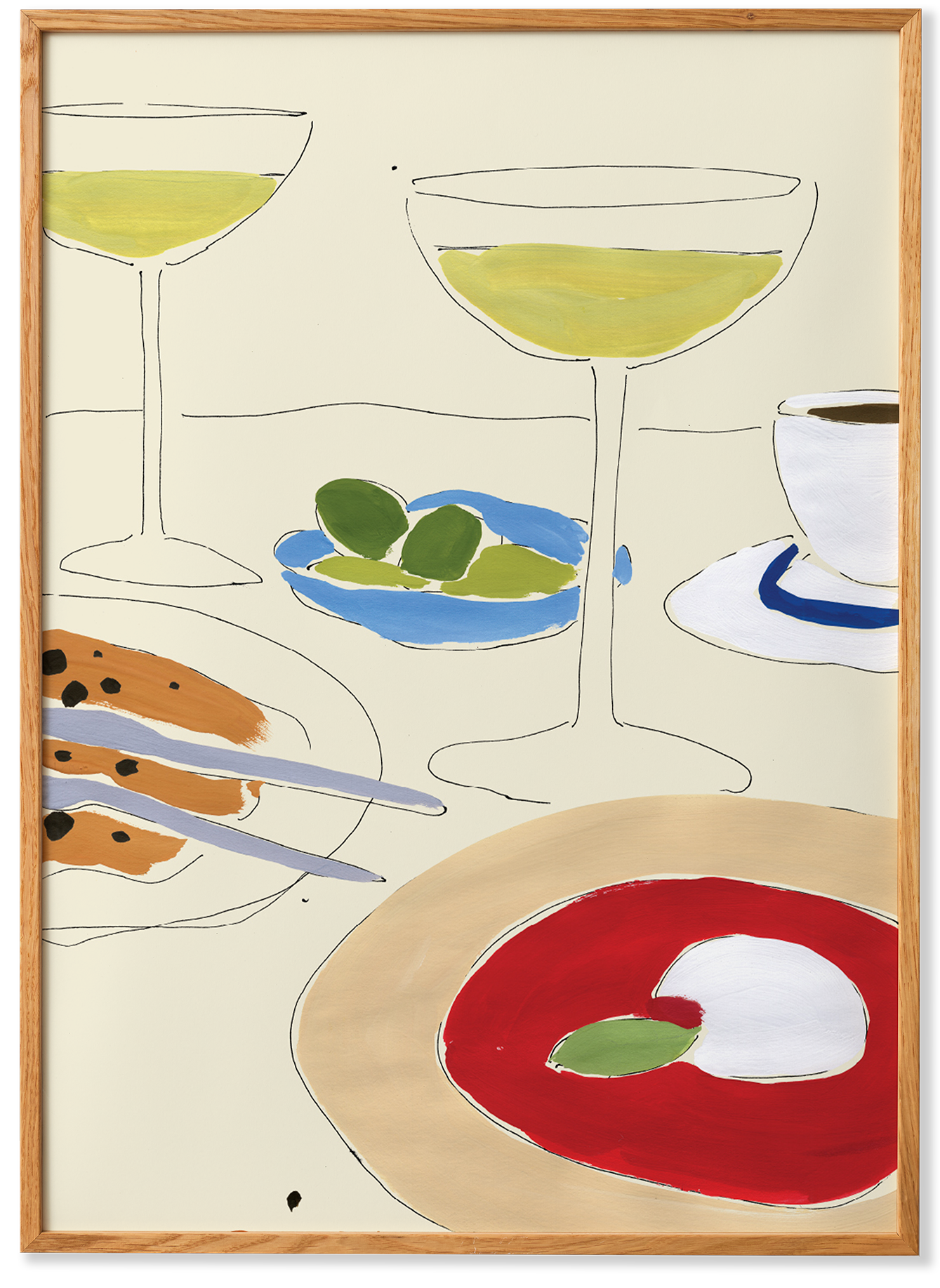 Martini Break is an art print by the Rome based artist Sia Marche. Chanelling the romance and spirit of Tuscany in which she lives and works, Marche's first collection for Paper Collective focuses on simple moments and acts of pleasure. Created from gouche and thin lines in black ink, her compositions transport you to a moment in the Italian countryside where great food and wine take centre stage.