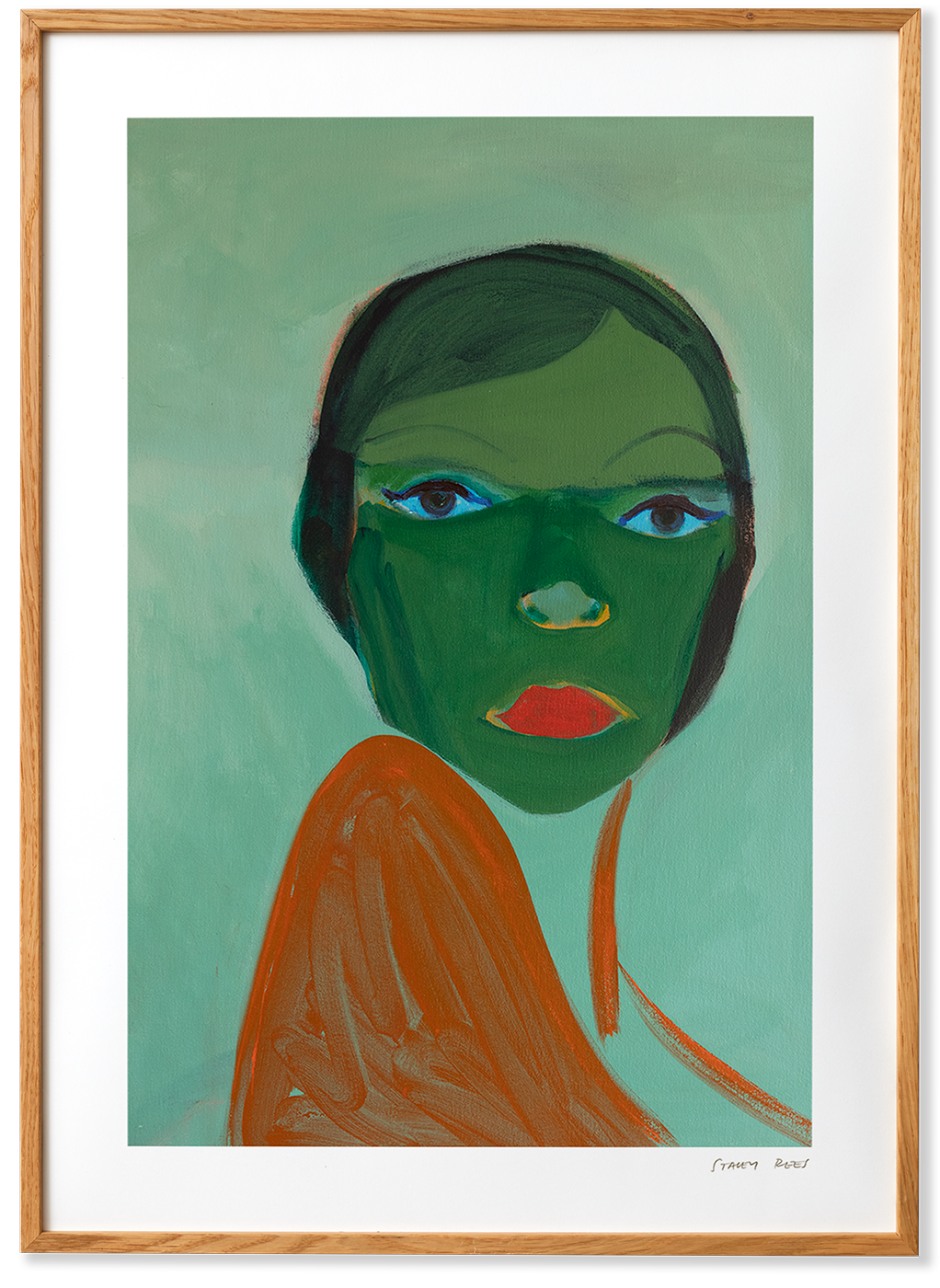 Australian artist Stacey Rees balances the figurative and the abstract with her first collection of six art prints for Paper Collective. For the painting Mode, Rees fuses green tones to create the backdrop and features of a female figure, brought to life through her striking red lips and shrouded in a texturally rich orange top.