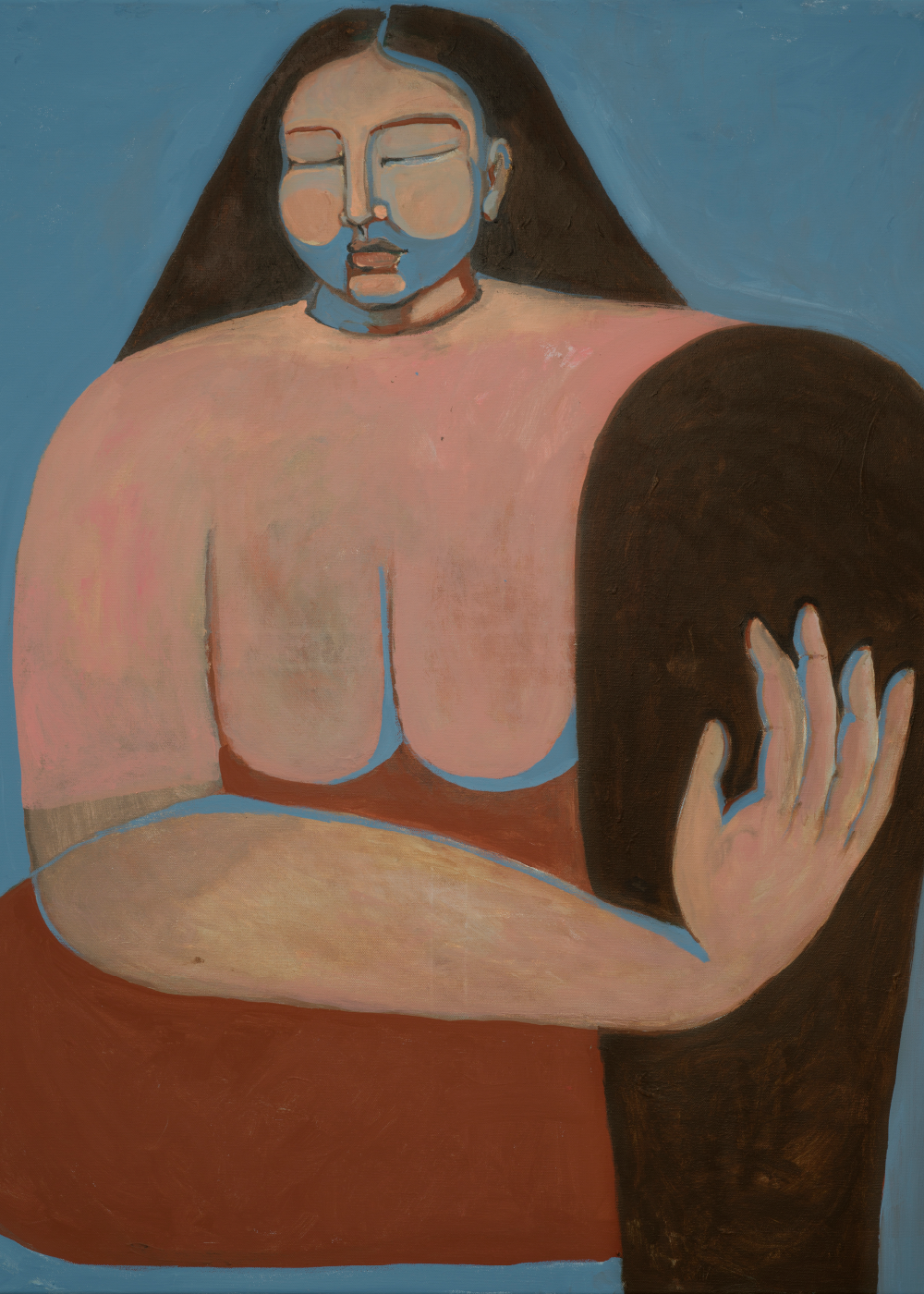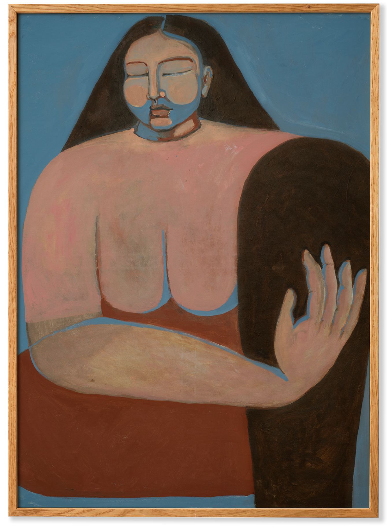 Namaste is a vibrant figurative art print by the Swedish artist Josefin Tolstoy. As the name suggests, a peaceful female figure is calmly seated, her body made up from a series of solid forms in shades of pink, maroon and earhty red. Set against a striking blue, the composition is powerful yet understated.