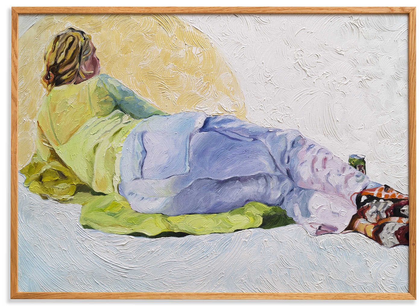Olimpia is an art print by Copenhagen based artist Lolita Pelegrime. Bringing to mind Manet's "Olympia", Pelegrime's composition offers a modern take on the classic - a reclined figure in tones of light green, white and soft shades of perple. A modesty in motif is matched by the soothing tones of the artwork.