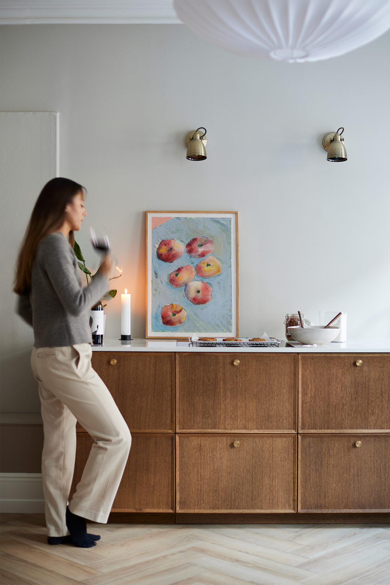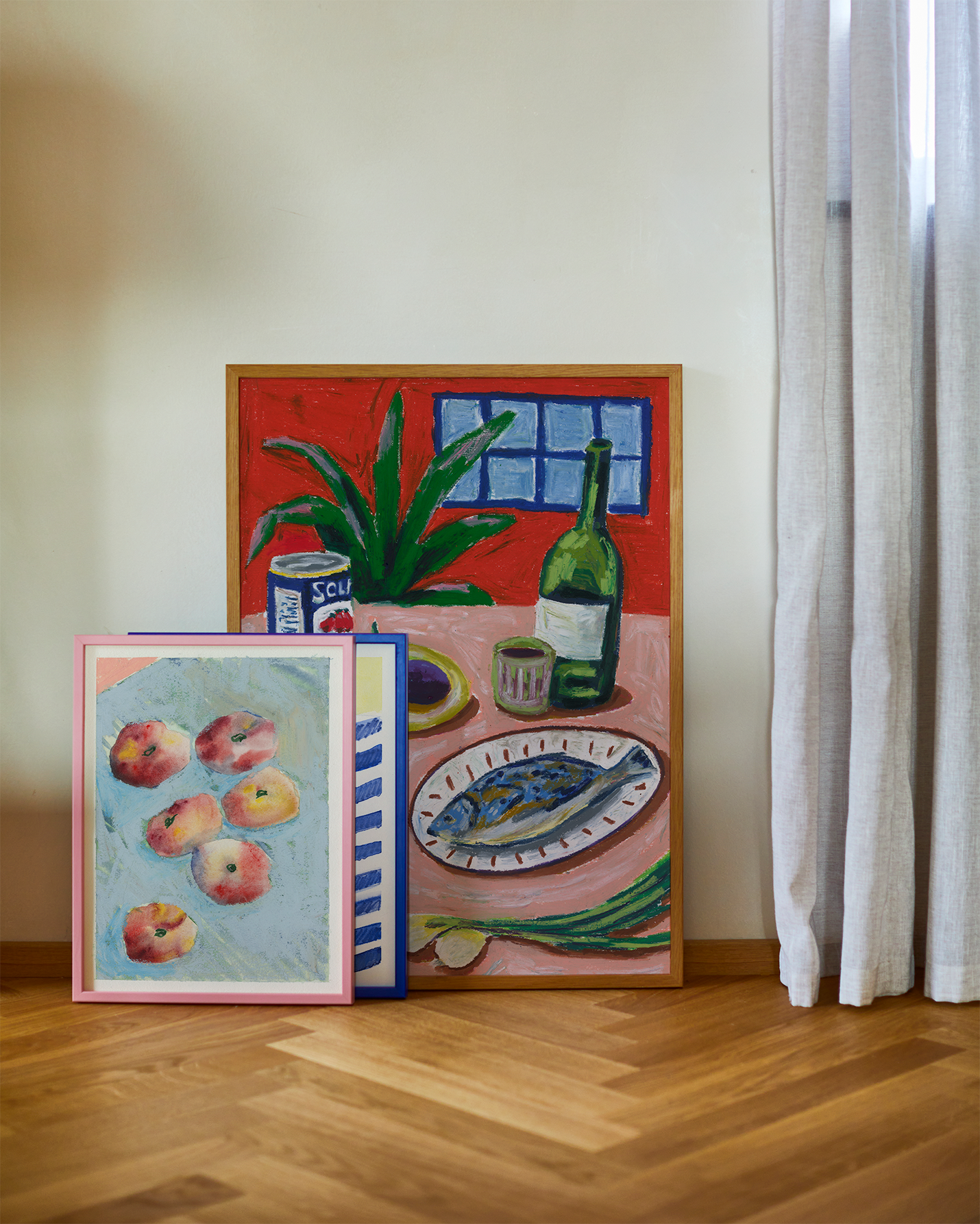 Stockholmsbaserade konstnären Liat Greenberg hyllar fruktens toner och texturer i sitt konsttryck Peaches. Med hjälp av hennes signatur drömmande blandning av akvareller och pasteller, är kompositionerna både djärva men ändå subtila, en bordsskiva av persikor i mjuka toner av rosa, röd och gul pop mot ett fläckigt blått tyg. Intuitiv och instinktiv i sitt förhållningssätt till komposition och form, har Greenberg presenterat en bit fräsch sommar när frukten är som mest levande och full av smak.