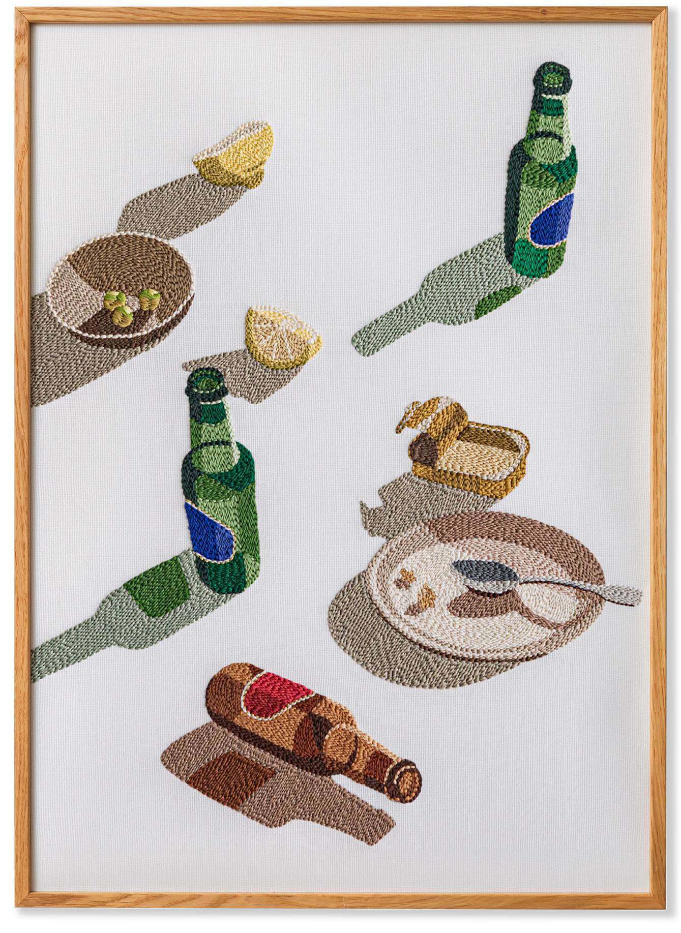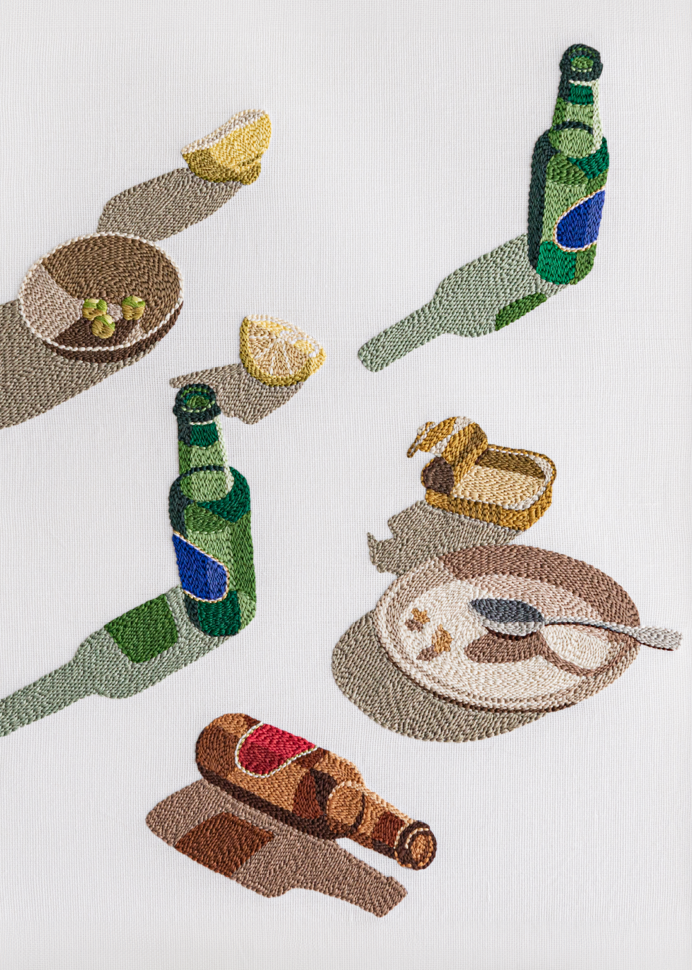 With her first collection for Paper Collective, Adrienna Matzeg captures the essence of hot afternoons, reflecting on the connection and joy that come from sharing drinks and snacks with others. Quarter To Four transforms her photography into intricate embroidery, the composition evoking a dreamlike nostalgia that preserve her snapshots in textile form.