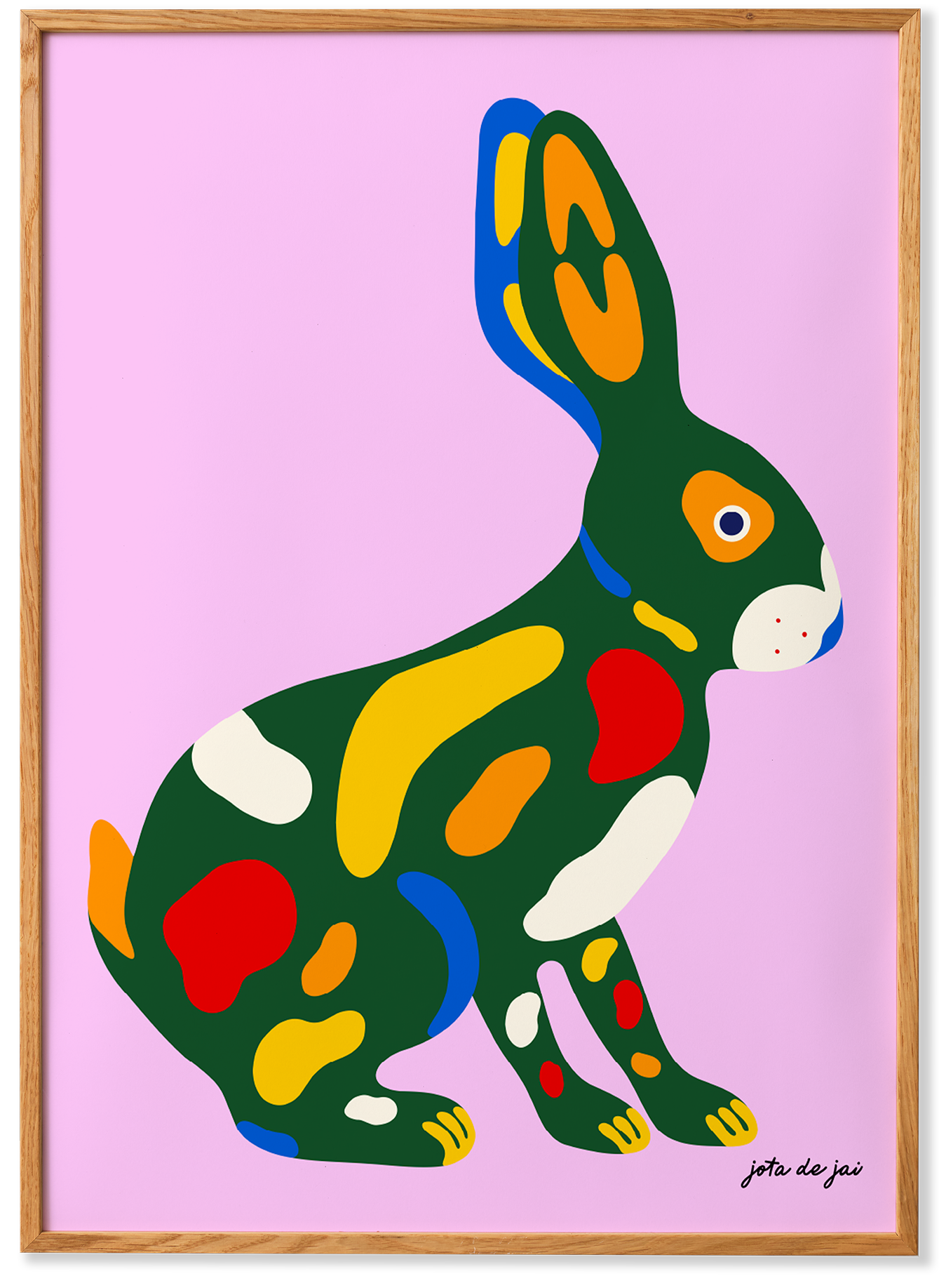 Rabbit by Spanish artists Jota De Jai is part of a family of illustrated animals inspired by Polish folk art. Each illustration is an attepmt to reduce the complexity of an animal to its simplest and most essential form. Through bold colours and simple patterns, the character of each animals is brought to life through a sense of fun and play.