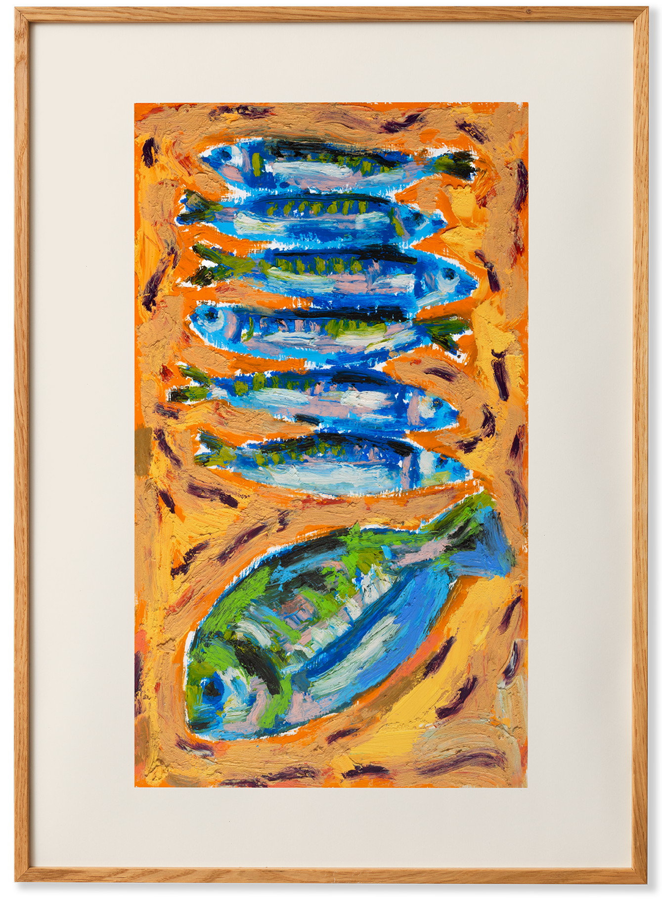 Seven Fish by artist Adee Ardon stems from the spontaneity of the creative process. Created without sketching or planning, colour and form combine through the use of thick oil pastels on a timber board. Letting go of perfection in way of therapeutic creativity, the composition expresses the richness of Mediterranean sea.