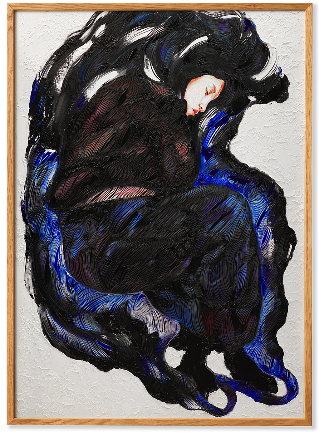 Presented through swirling abstract forms, Sleeping Girl by Lolita Pelegrime highlights a figure nestled within. A single female face stands out of a textural mix of acrylic paint in tones of blue and black that mirror the outline of her human form.