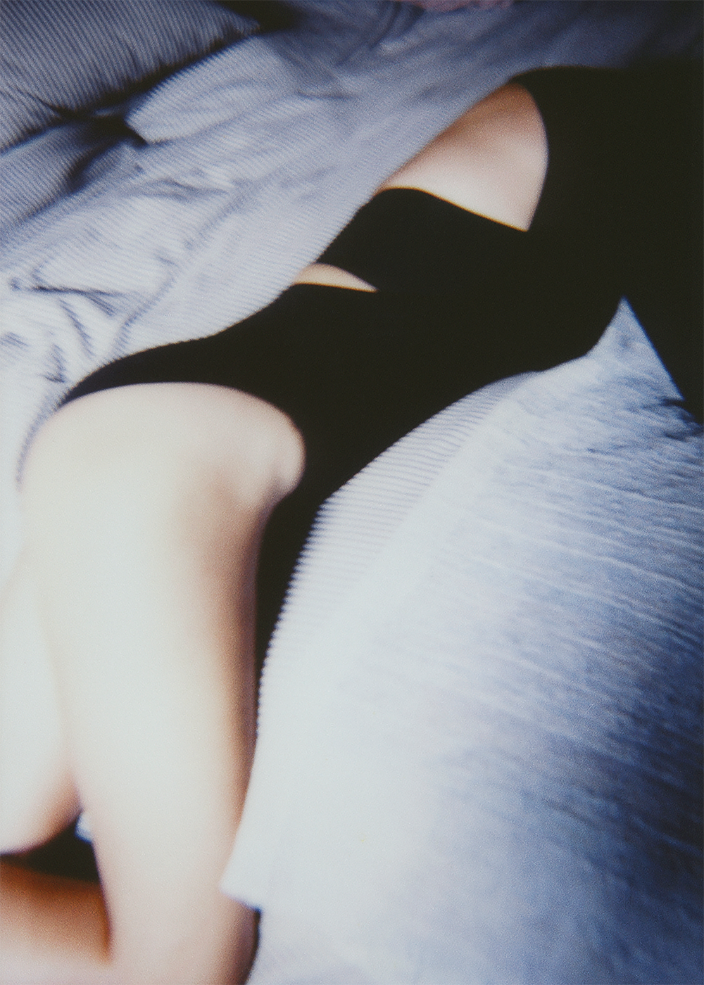 Genom att kanalisera vintage polaroidfilm skapade den danske fotografen Henrik Bülow Snooze som en voyeuristisk titt in i en privat scen. En singelfigur ligger på sängen, iklädd svarta plagg som skapar en grafisk kontrast till den överexponerade miljön av mjukt grått.