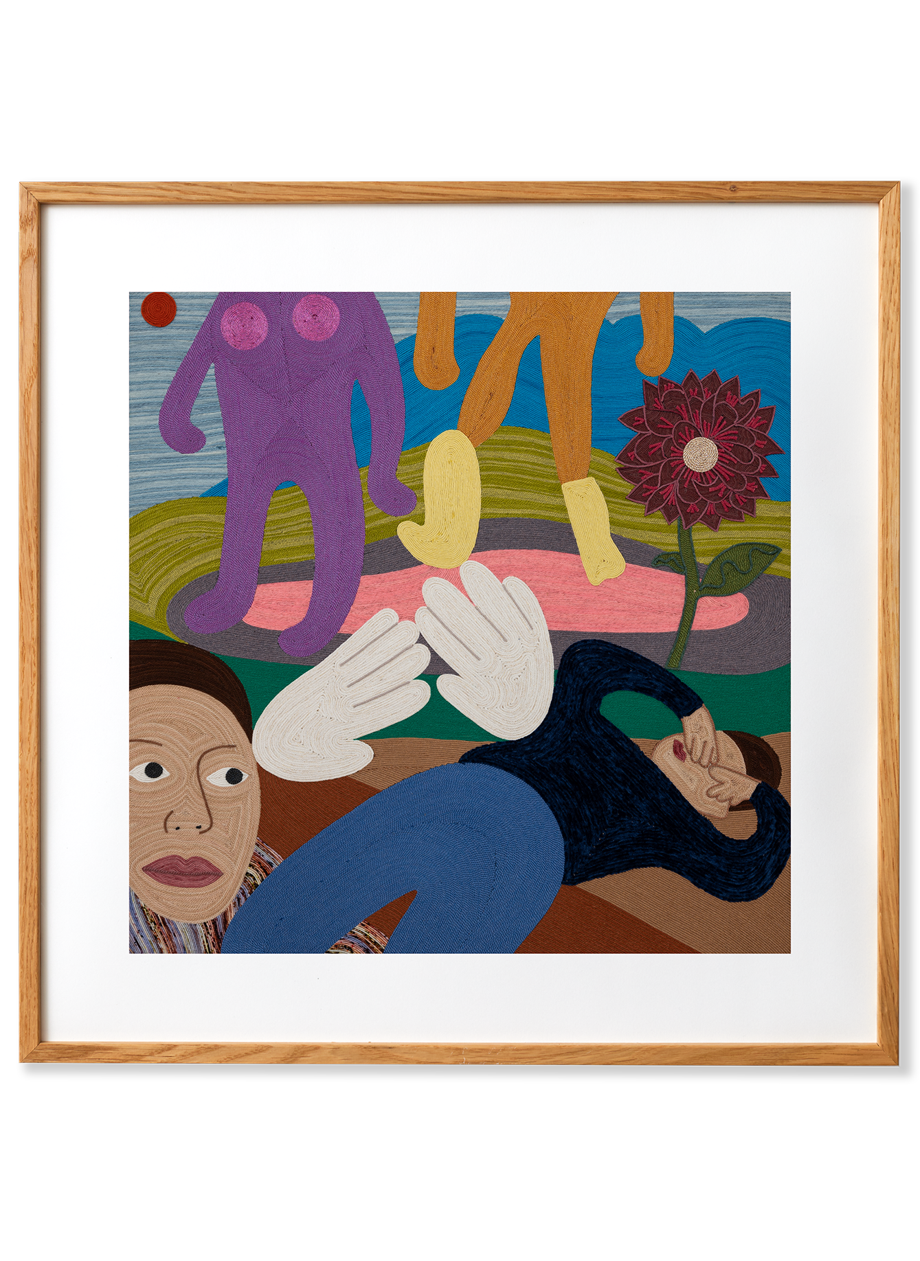 Soñando Despierto is an art print by the Colombian artist Paola Rodriguez. The first collection by Paola Rodriguez for Paper Collective is an exploration into traditional Colombian storytelling and folkart through her use of coiled yarn to create compositions. Colourful, eclectic and slightly surreal, her work is full of depth and character.