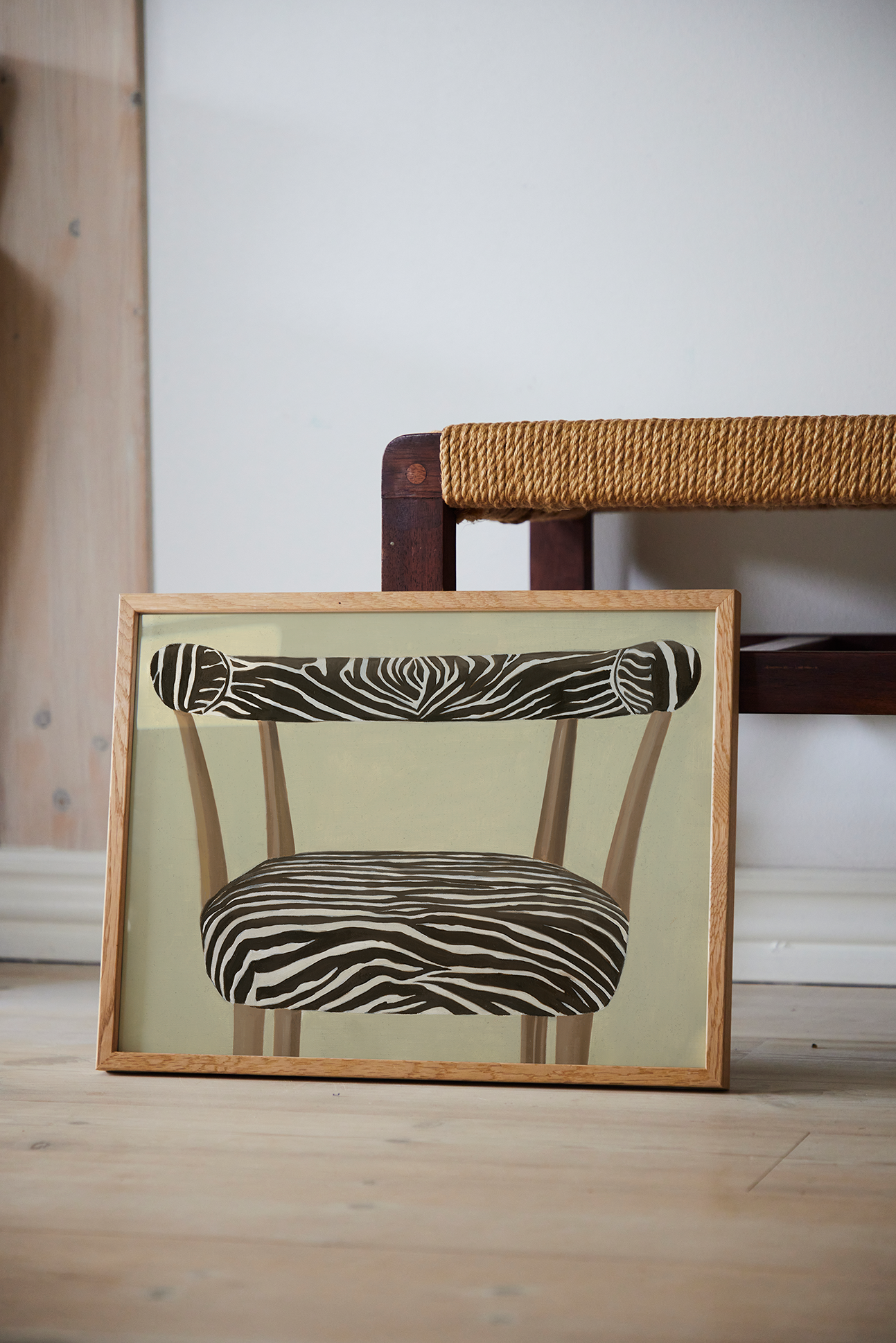 Stolen av den Stockholmsbaserade konstnären och illustratören Jonna Valtner är en subtil övning i begär och de materiella ägodelar som skapar våra dagliga miljöer. En enda stol sitter mellan återhållsamhet och överflöd – det är en enkel konstruktion upphöjd genom den zebramönstrade klädseln som pryder både sittdyna och rygg. Valtners användning av oljefärg på duk skapar en spännande blandning av verklighet och fiktion, eftersom en närmare granskning avslöjar bristerna i verket.