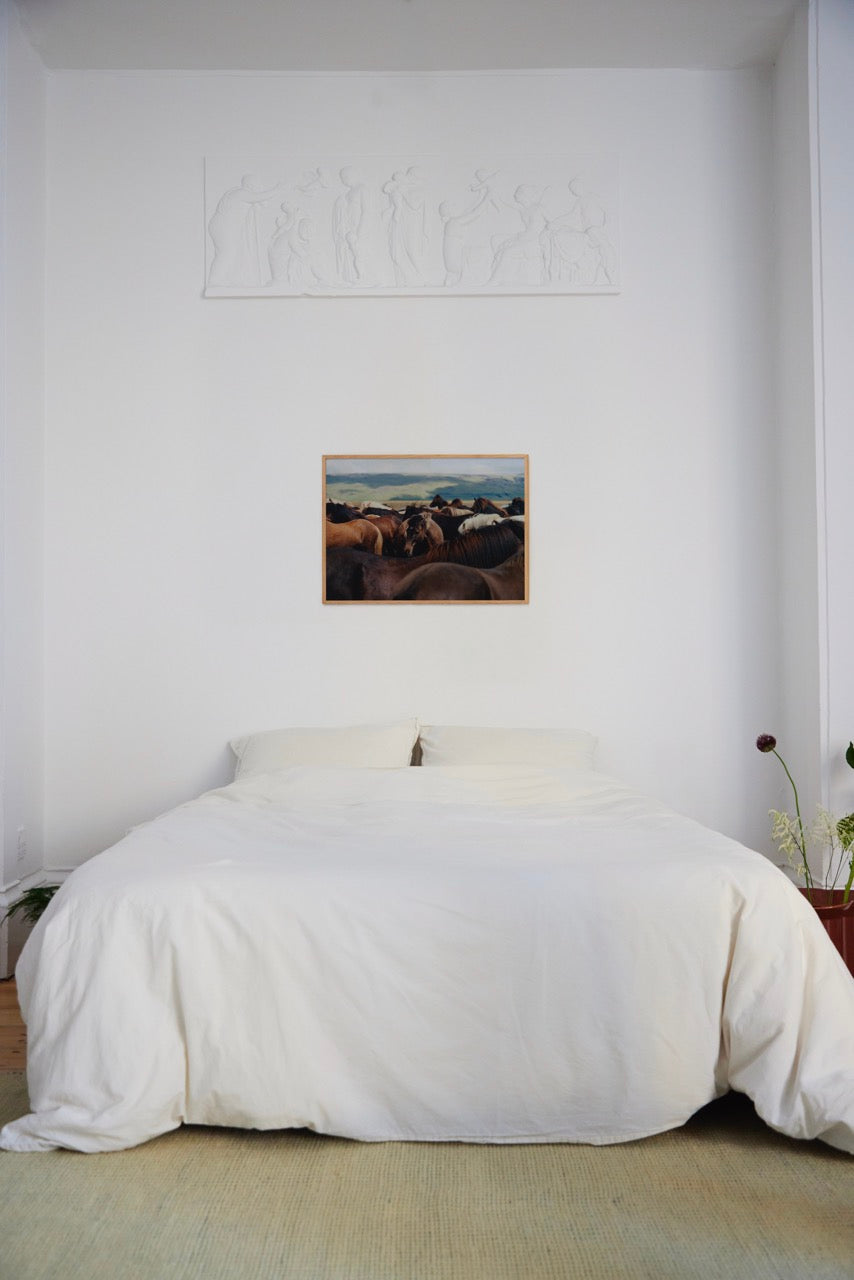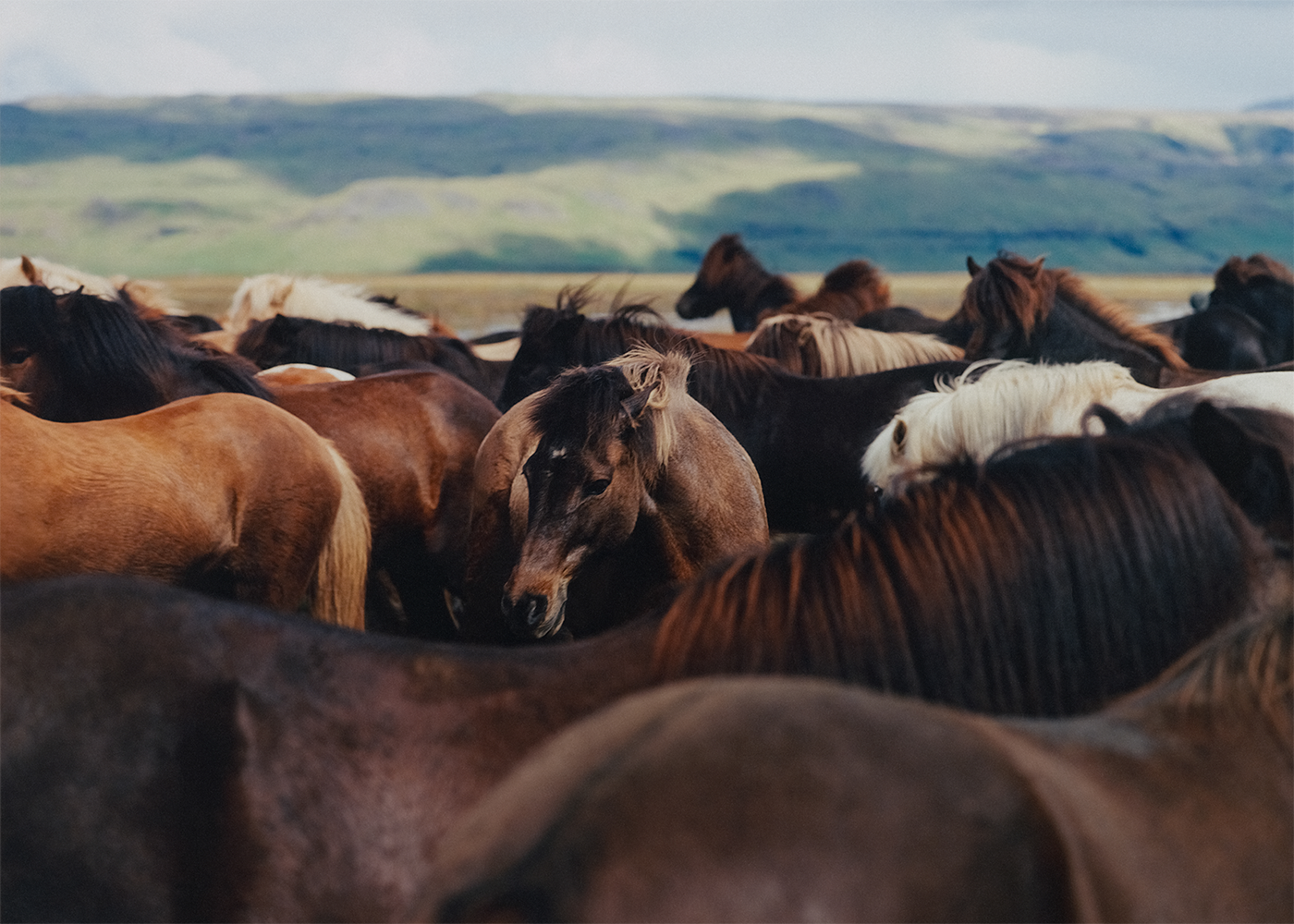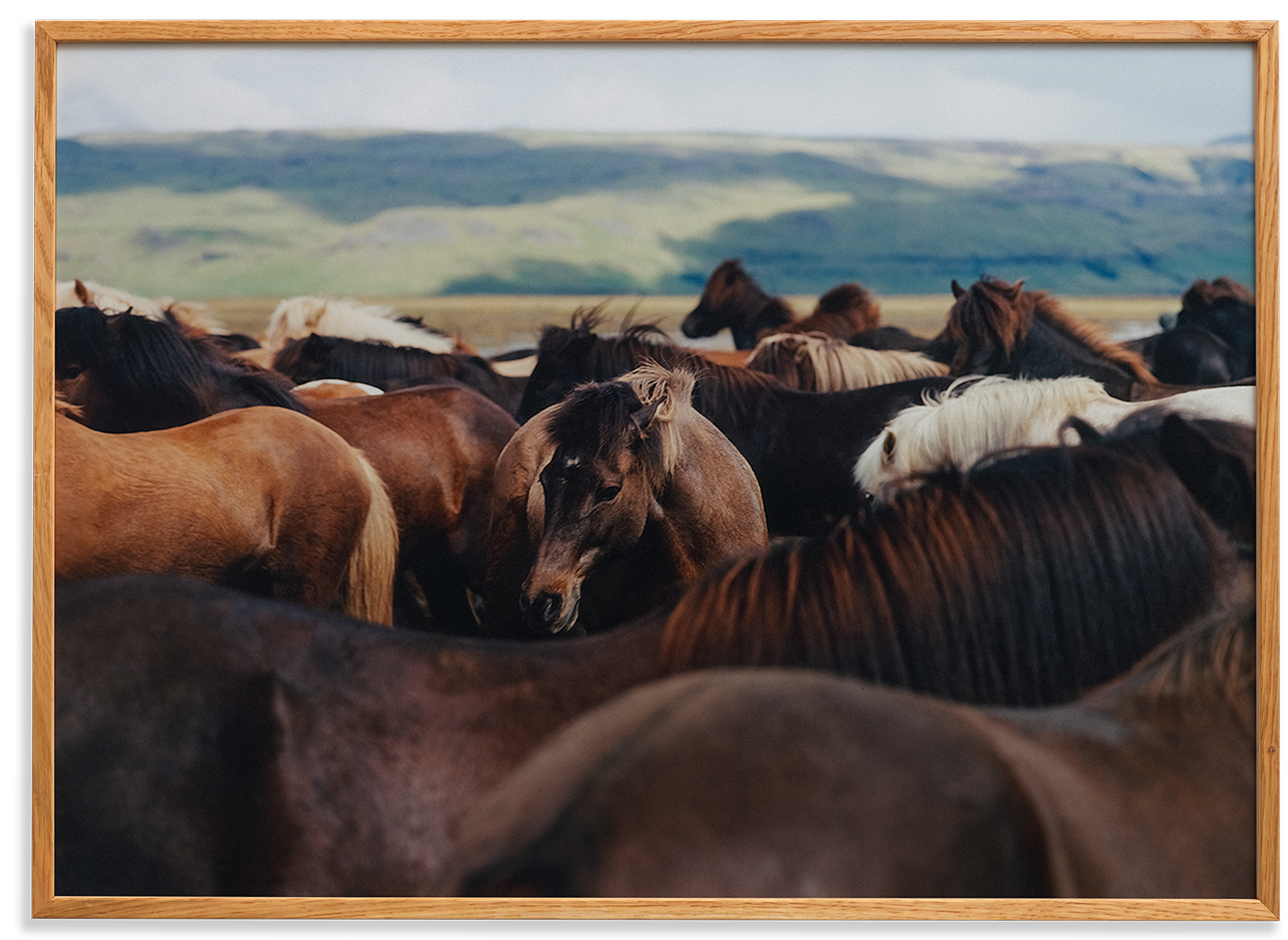 The Herd 02 forms one half of Mark Toren's first photographic collection for Paper Collective. Shot with film on a Kodak Ektar 100, the depth and character of the analogue development process remains in the final art print, with a single charecter spotted as if looking into the lens. Shot during a summer visit to Iceland, Toren came across a group of rangers who take their herd of Icelandic Horses across the island each year.