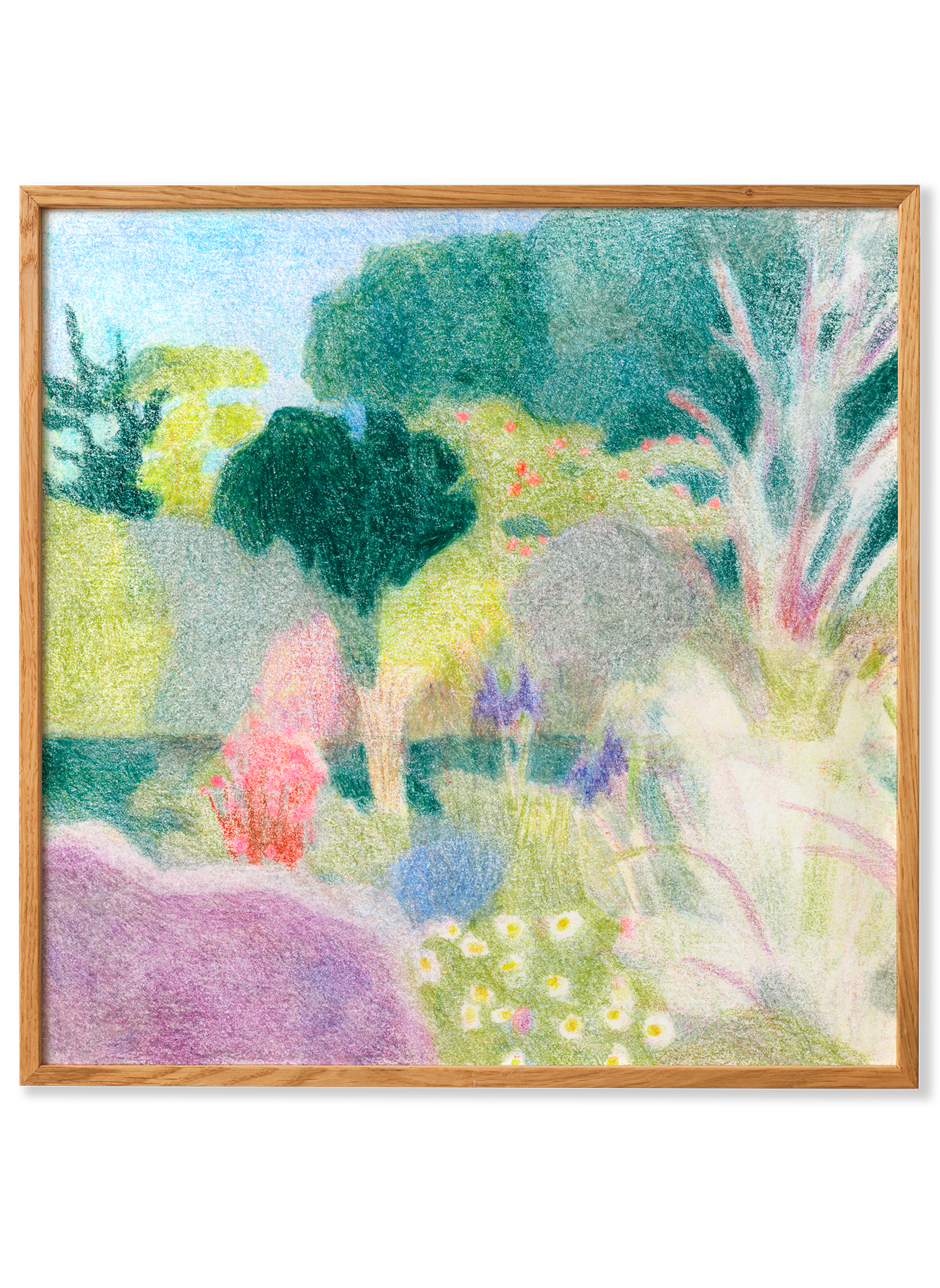 Un Jardin à Kergoët is an art print by French illustrator Line Hachem. Hachem's first collection of works for Paper Collective excude a sense of youthfull energy through her subjects, alongside vibrant colours and textures. Capturing moments in nature with friends, each compostion is created through delicate linework in pencil, coming together to create compositions that are both humble yet captivating.