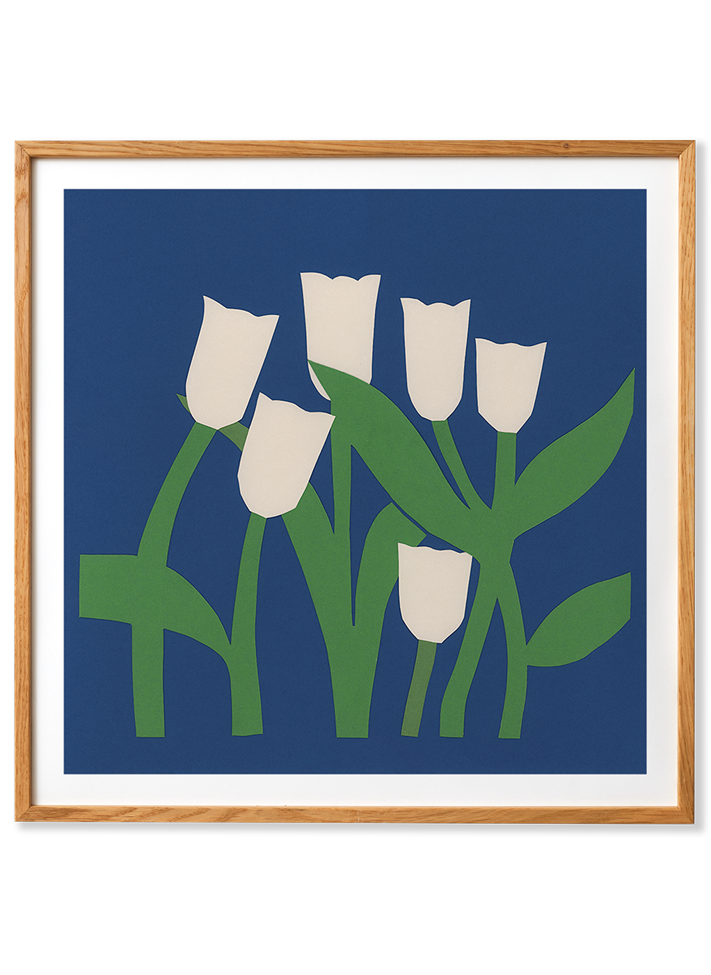 With her first collection for Paper Collective, Toronto based illustator Leia Bryans has focused on simple compositions that reflect everyday life. White Tulips depicts a bouquet in white and green against a vibrant blue backdrop. Created from cut-out origami paper, the angled appearence of each flower juxtaposes with the organic subject.